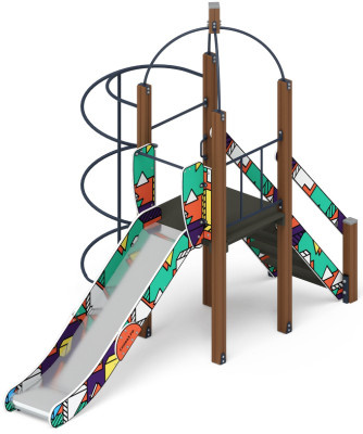 Скат горки шириной 530 мм, выполнен из нержавеющей стали t=1,5 мм, - цельного листа, борта выполнены из влагостойкой фанеры толщиной 24 мм, кромки фанеры тщательно шлифованы, борта окрашены при помощи УФ печати, принт - в стиле «Техно-голубой»- основной цвет принта светло-серый. Ограждения стартового участка горки, выполнены из влагостойкой фанеры толщиной 18 мм. Опорный каркас горки выполнен из профиля 40х25 и труб диаметром 32 мм (металл имеет плавные радиусы и тщательную обработку швов, покрыт порошковой краской)