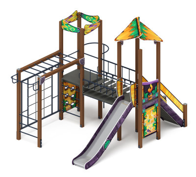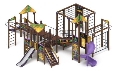 Спаренные башня из шести клеёных брусьев 100х100 мм высота 3500мм- 4 шт, 3000мм- 2 шт. У одной башни полы двухуровневые, выполнены из ламинированной фанеры, с анти-скользящим покрытием мм толщиной 18 мм, габарит 1000х1000 мм (2 шт). Кромки фанеры тщательно шлифованы. Отметка пола башни от планировочной отметки площадки 1200 мм и 1500 мм. Башня украшена крышей. Крыша располагается над одной из частей спаренных башен. Крыша выполнены как соединение двух скатов треугольной формы, выполненных из влагостойкой фанеры толщиной 18 мм, габарит ската 1500х1000х18 мм. Скаты соединяются между собой и крепятся к опорному брусу при помощи креплений из влагостойкой фанеры толщиной 18 мм, кромки фанеры тщательно шлифованы, борта окрашены при помощи УФ печати, принт Майя. |