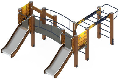 Борта выполнены влагостойкой фанеры толщиной 24 мм. В комплекте 2 шт. и перекладин из трубы диаметром 27 мм. Борта рукохода крепятся к брусу малой башни и двум столбам шведской стенки |