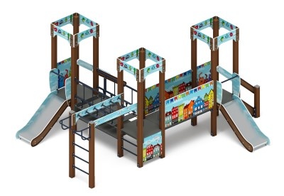 Спаренная башня из шести клеёных брусьев 100х100 мм высота 2500 мм-4 шт и 1500 мм- 2 шт; полы из ламинированной фанеры, с анти-скользящим покрытием 780х780мм толщиной 18мм. Башня украшена стилизованными декоративными арками (780х330х18мм) и четырехскатной крышей, крыша поставляется в сборе и выполнена из влагостойкой фанеры толщиной 12 мм (габариты в сборе 770х770х740мм), кромки фанеры тщательно шлифованы, окрашены с нанесением принта. Отметка пола башни от планировочной отметки площадки 900мм и 750мм. |