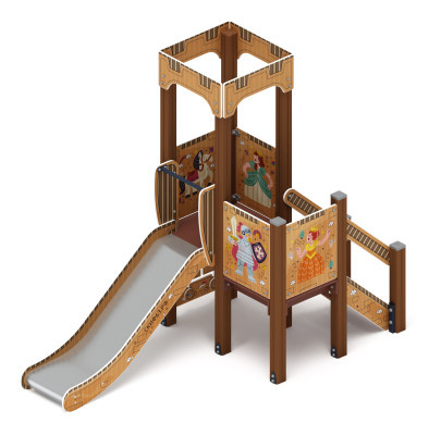 Спаренная башня из шести клеёных брусьев 100х100 мм высота 2500 мм-4 шт и 1500 мм- 2 шт; полы из ламинированной фанеры, с анти-скользящим покрытием 780х780мм толщиной 18мм. Башня украшена стилизованными декоративными арками (780х330х18мм) и четырехскатной крышей, крыша поставляется в сборе и выполнена из влагостойкой фанеры толщиной 12 мм (габариты в сборе 770х770х740мм), кромки фанеры тщательно шлифованы, окрашены с нанесением принта. Отметка пола башни от планировочной отметки площадки 900мм и 750мм. |