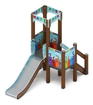 Выполнена из четырёх клеёных брусьев, окрашенных в коричневый цвет, сечением 100х100 мм и высотой 2500 мм. Пол из ламинированной фанеры с антискользящим покрытием размером 780х780 мм толщиной 18 мм. Башня без крыши, украшена стилизованными декоративными арками, кромки фанеры тщательно шлифованы, окрашены с нанесением принта. Отметка пола башни от планировочной отметки площадки 750 мм |