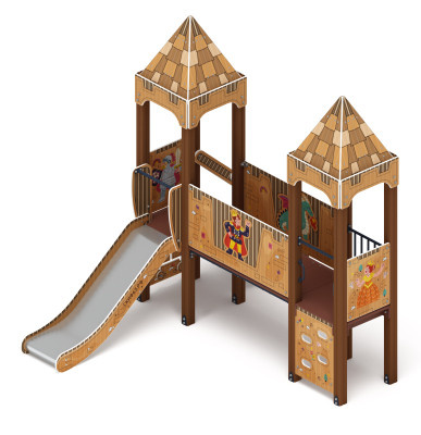 Выполнена из четырёх клеёных брусьев, окрашенных в коричневый цвет, сечением 100х100 мм и высотой 2500 мм. Пол из ламинированной фанеры с антискользящим покрытием размером 780х780 мм толщиной 18 мм. Башня без крыши, украшена стилизованными декоративными арками, кромки фанеры тщательно шлифованы, окрашены с нанесением принта. Отметка пола башни от планировочной отметки площадки 900 мм |