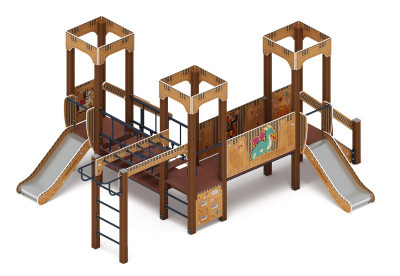 Выполнена из четырёх клеёных брусьев, окрашенных в коричневый цвет, сечением 100х100 мм и высотой 2500 мм. Пол из ламинированной фанеры с антискользящим покрытием размером 780х780 мм толщиной 18 мм. Башня украшена стилизованными декоративными арками (780х330х18мм) и четырехскатной крышей, крыша поставляется в сборе и выполнена из влагостойкой фанеры толщиной 12 мм (габариты в сборе 770х770х740мм), кромки фанеры тщательно шлифованы, окрашены с нанесением принта. Отметка пола башни от планировочной отметки площадки 750 мм |