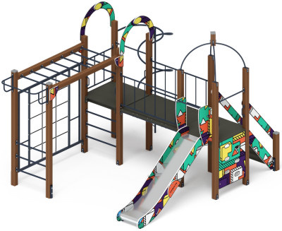 9 | Решетка для лазания | выполнена из сварного каркаса из профиля прямоугольного 40х25, профиля 40х40 и трубы диаметром 32 мм. Сварная конструкция является каркасом для сетки. Сетка из шести-прядного армированного полиамидного каната тросовой свивки диаметром 16 мм. На брус обвязки стоек крепится при помощи скоб через коуши. Канаты в местах пересечения фиксируются при помощи пластикового крестообразного соединителя для канатов диаметром 16 мм. Канаты помещаются в пазы соединителя, которые защёлкиваются между собой и фиксируются саморезом. Концы канатов заканчиваются коушем и фиксируются зажимной втулкой | комплект | |